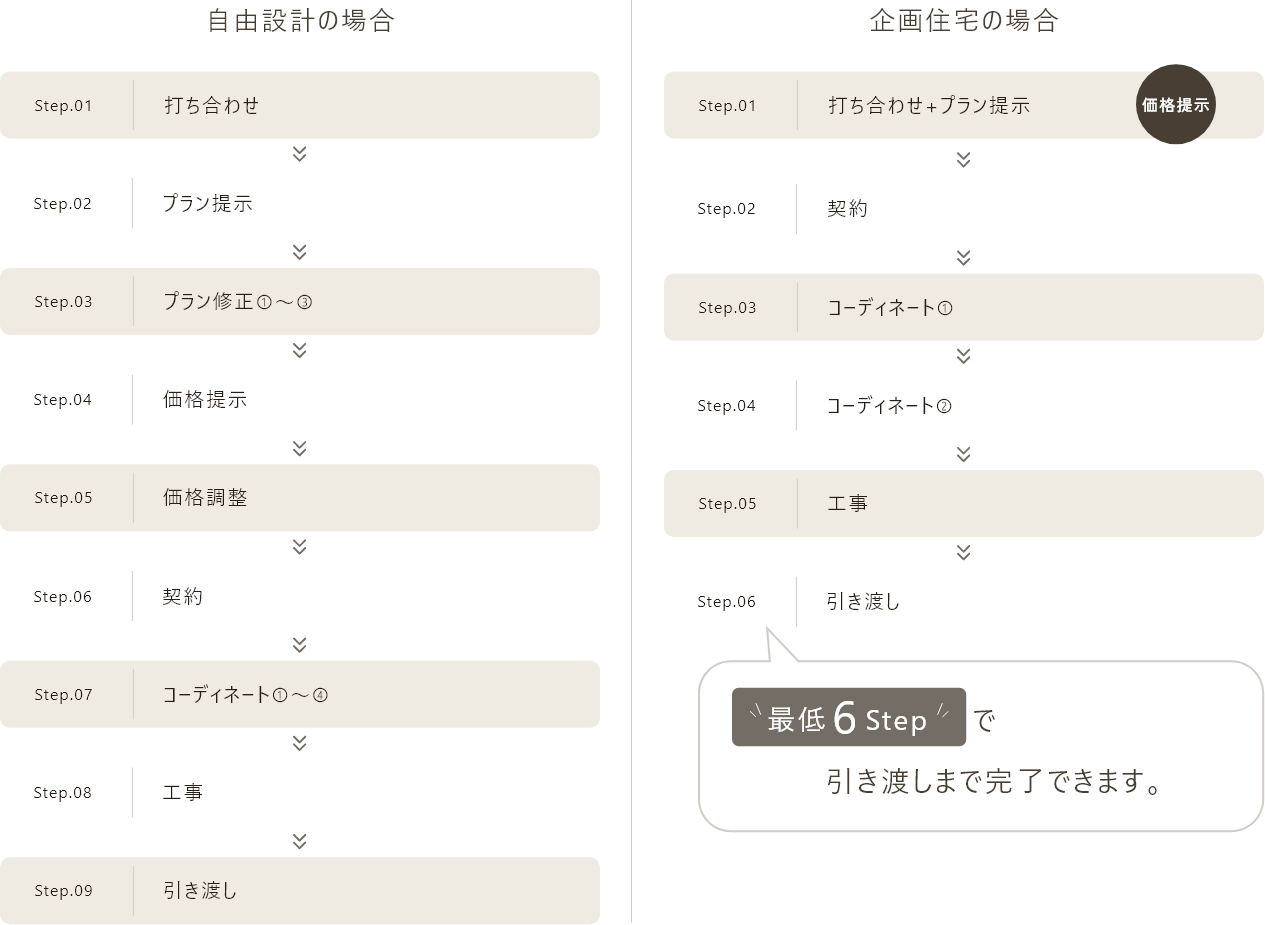 グリスマの企画住宅は、あらかじめプランと価格が決まっているから打ち合わせやプラン修正に時間をかけずに進められます。「考える時間」を減らして、完成までがスムーズなのが特徴です。