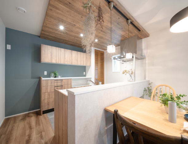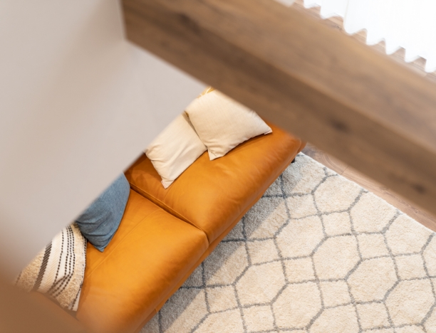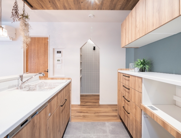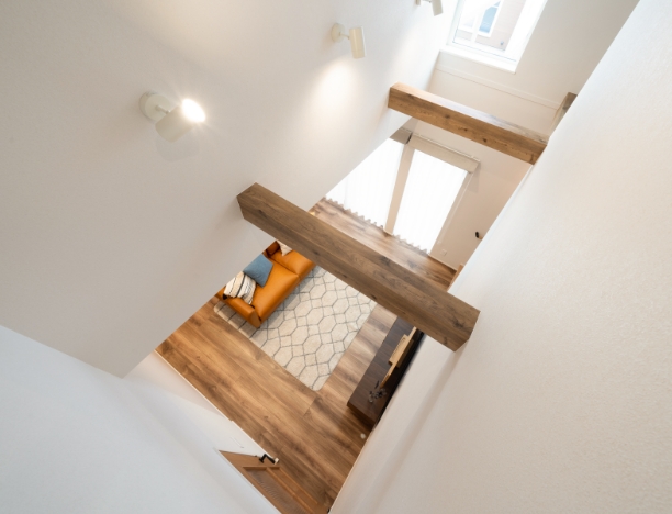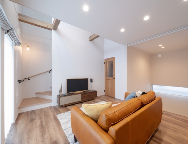 縦の空間を活かした吹き抜けでは、やわらかな光がリビングいっぱいに広がります。 キッチンから見上げればふと目が合い、ソファでくつろぐ時間も自然と会話が生まれる。 それぞれの時間も大切にしながら、家族のつながりも感じられる設計です。