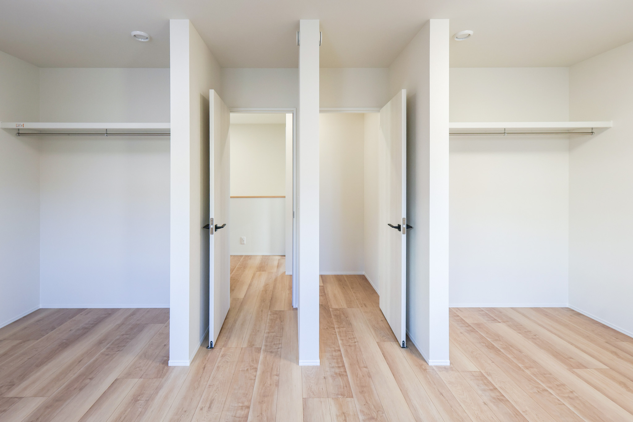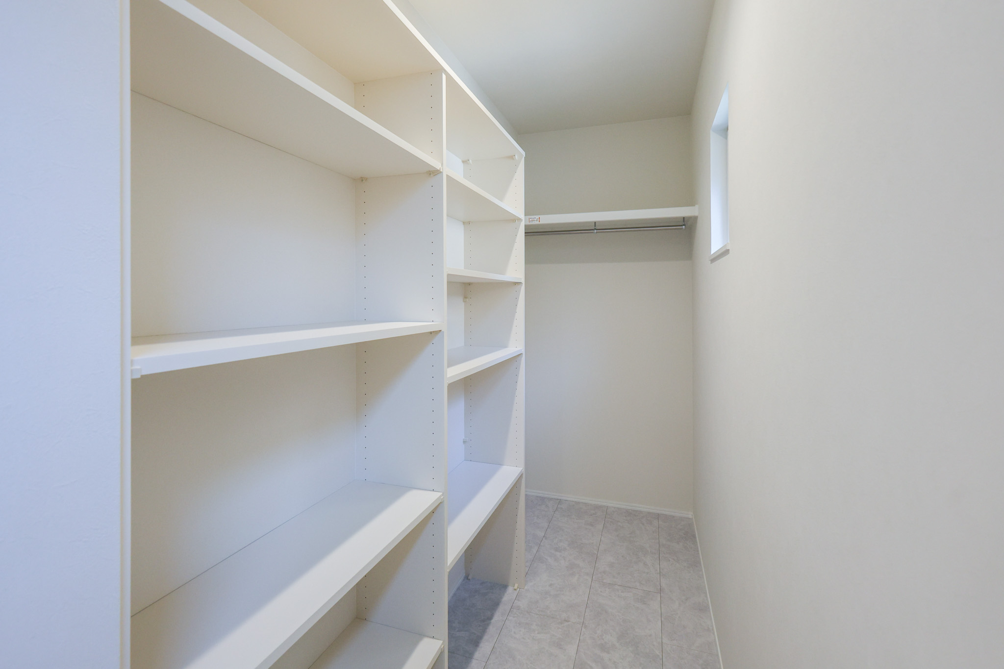 主寝室にはウォークインクローゼット+壁面収納を設置。衣類や季節物もまとめて収納でき、空間を広く使えます。