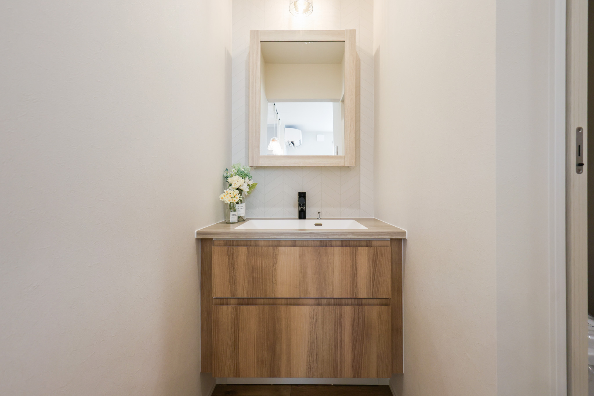 独立した洗面スペースで、帰宅後すぐに使える動線。家族の入浴中でも気兼ねなく使えるのも嬉しいポイントです。
