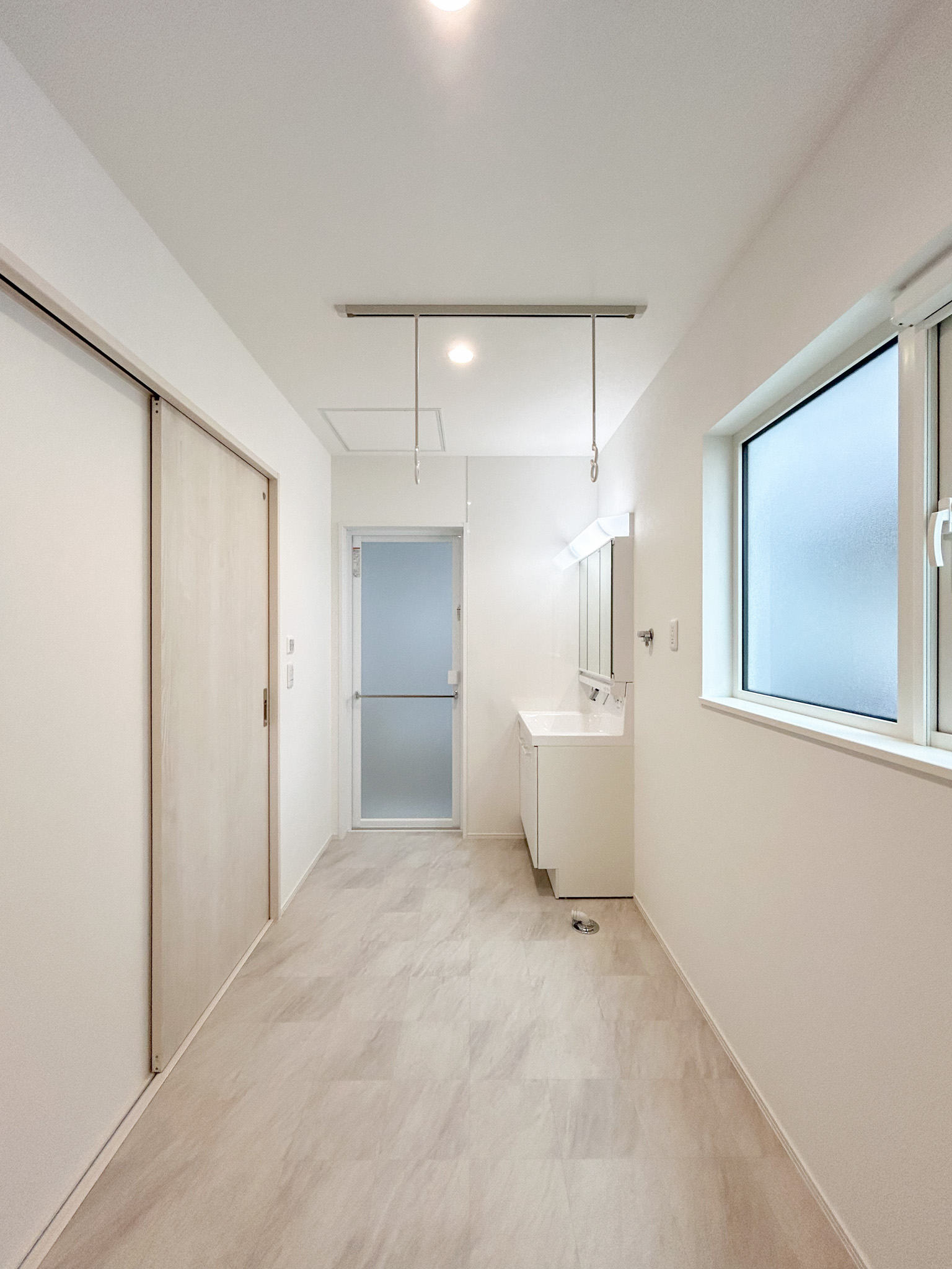 洗面所兼サンルームで「脱ぐ・洗う・干す」が一か所で完結。家事動線を短縮し、日々の負担を大きく軽減します。