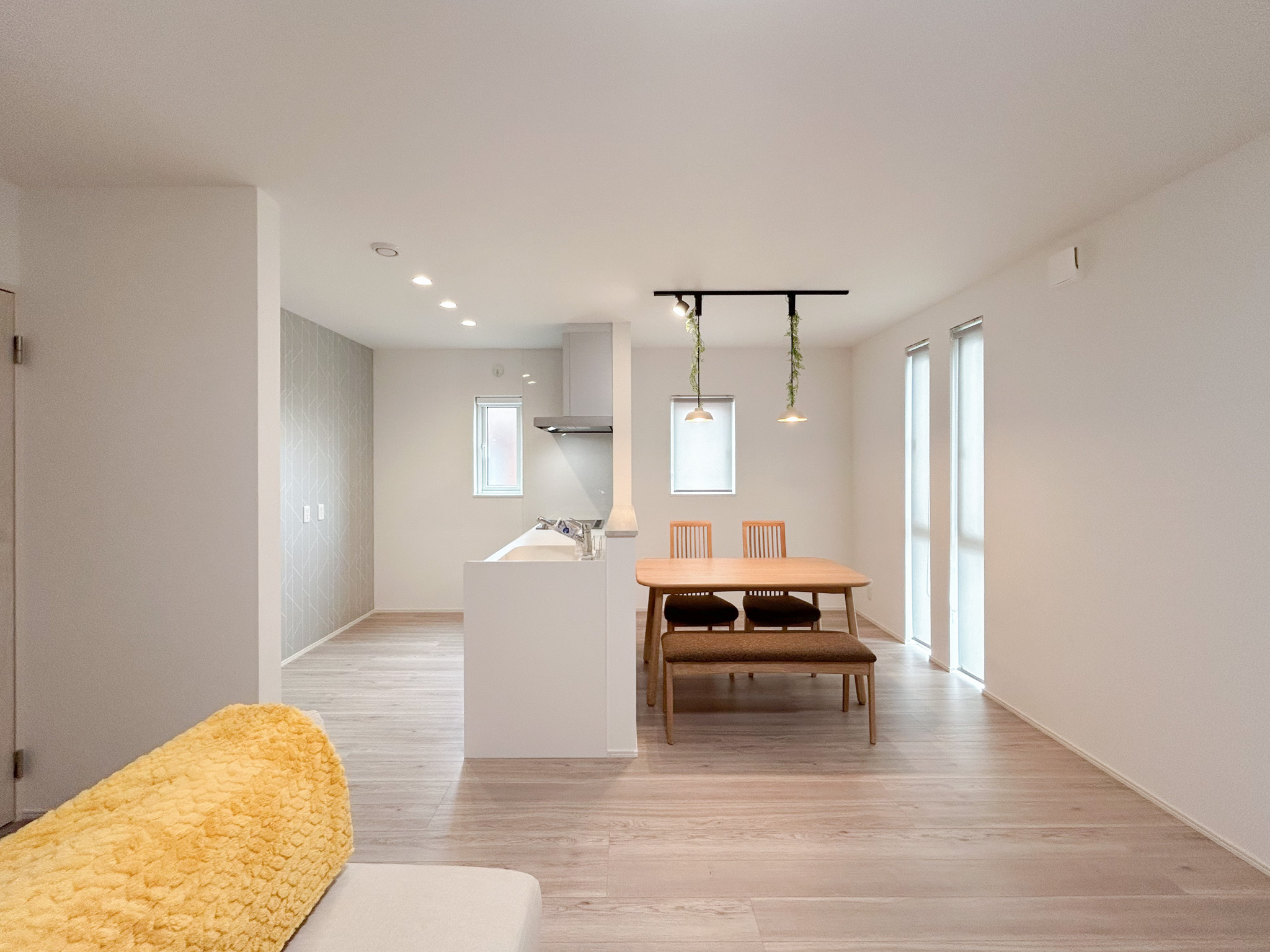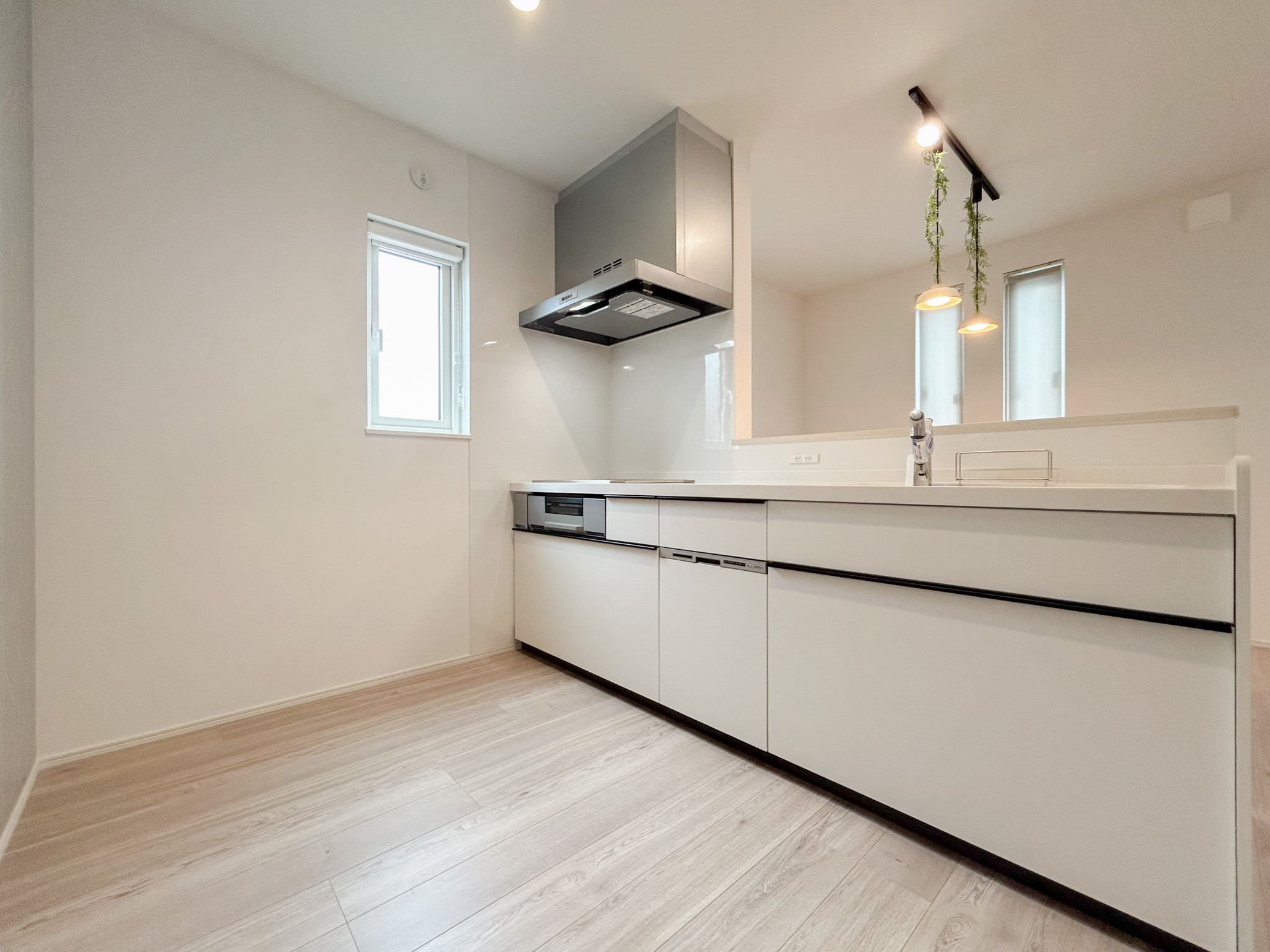 白を基調にまとめたキッチンは、清潔感と使いやすさを両立。調理から片付けまでスムーズに行えます。