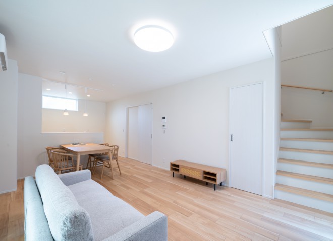 16.0帖のLDK。 テレビボードの横には階段下のデッドスペースを利用した階段下収納が室内外の2か所にあります。