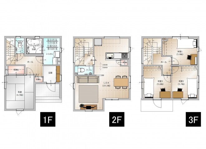 3F建ての4LDKと広々とした間取り。 和室もあり、LDKも広々!洋室も3部屋と様々な使い方ができます。