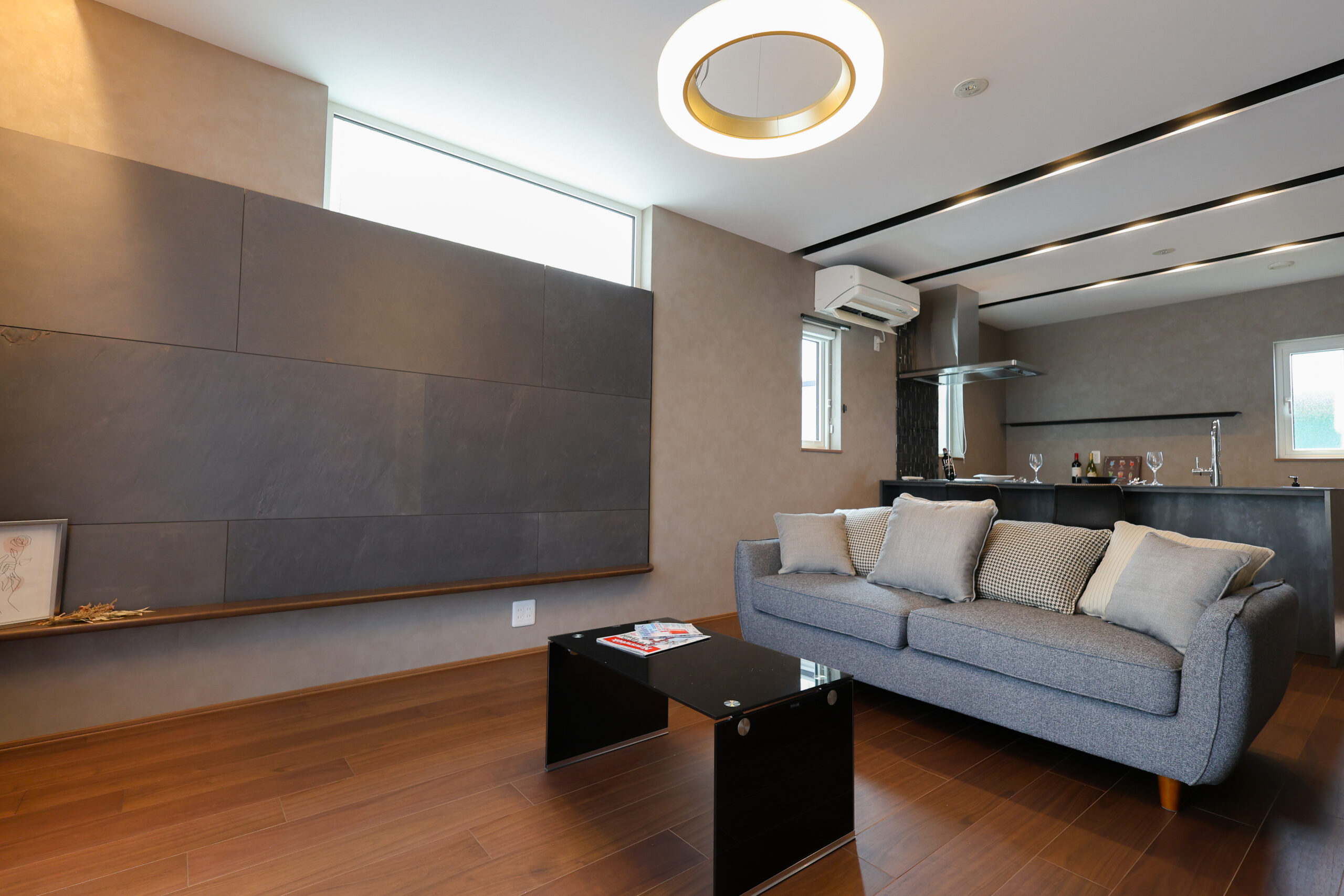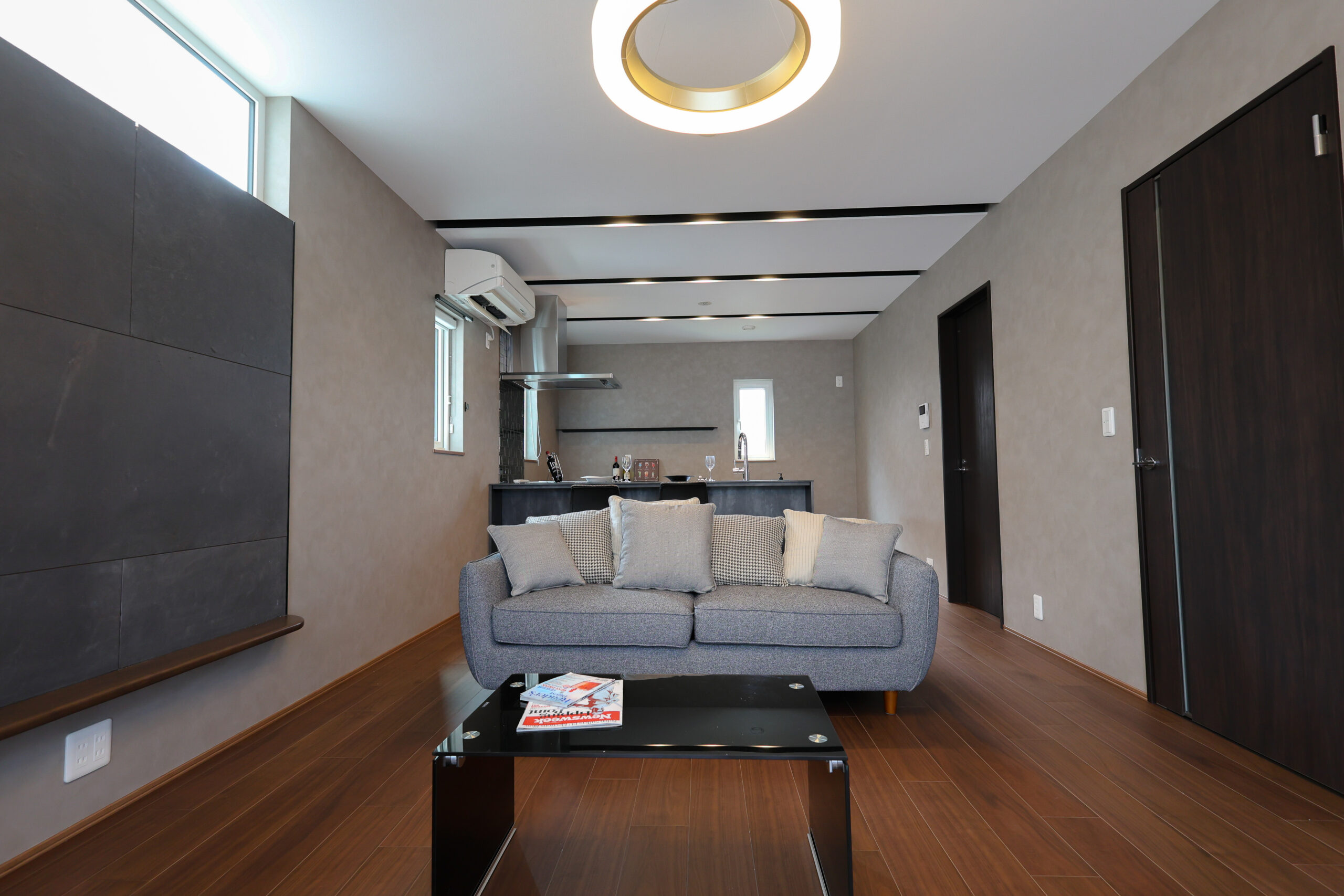 ホテルライクな空間美を意識し、上質で落ち着きのある雰囲気に仕上げました。縦長のレイアウトでゆとりある広さを確保し、ご家族がそれぞれ心地よく、ゆったりと過ごせる空間設計です。