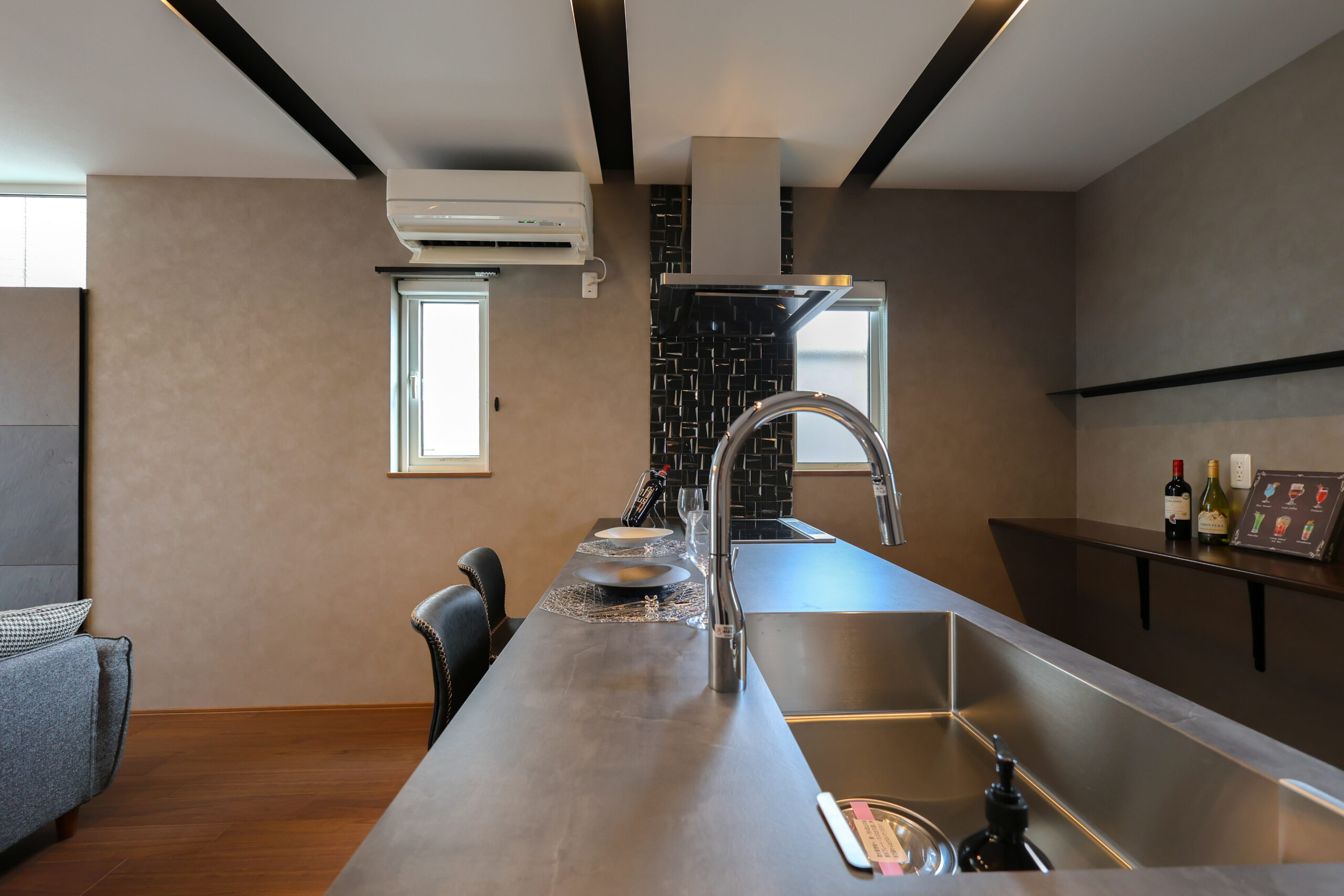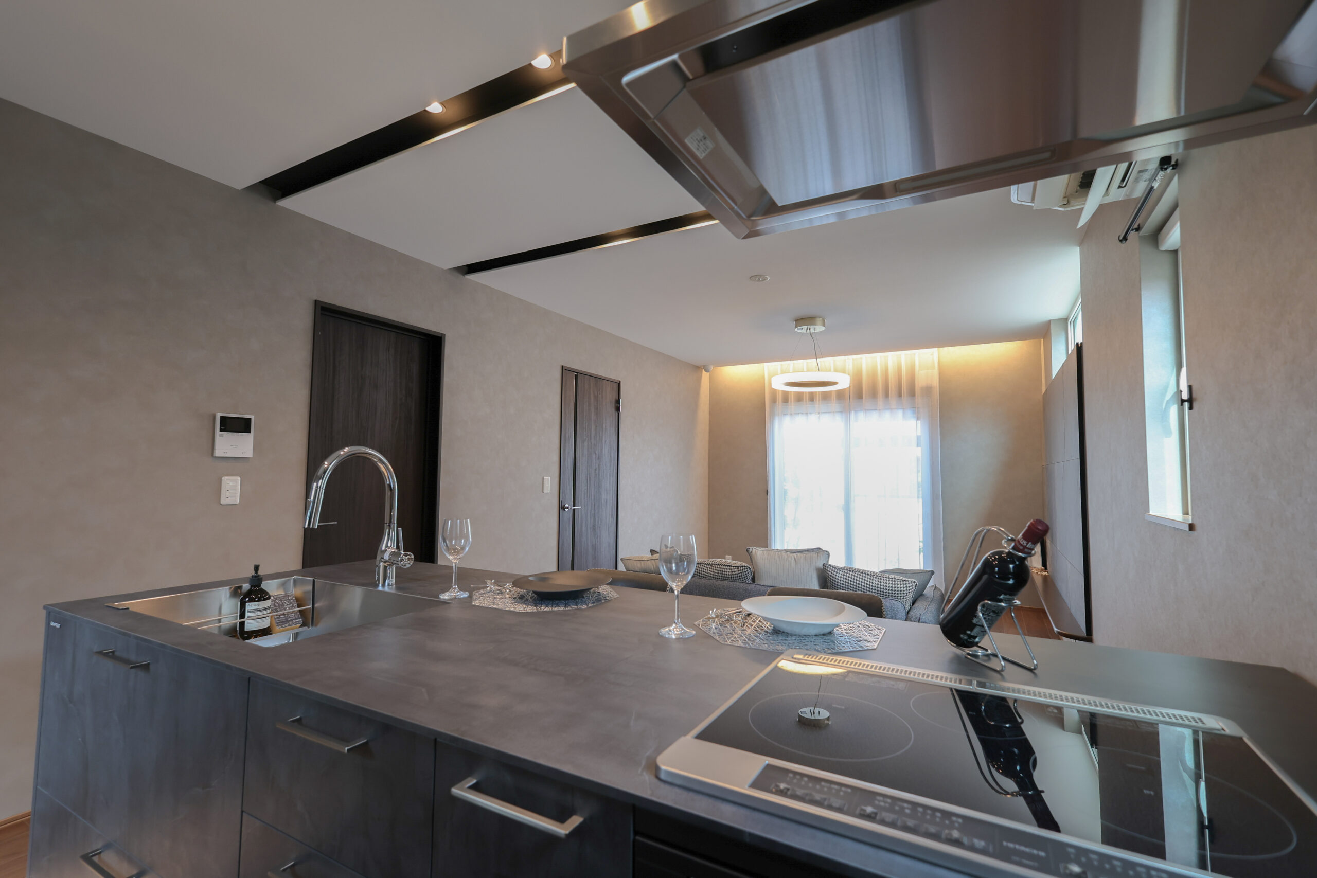 フラットに仕上げたキッチンと、上質なステンレス天板が美しく調和する空間。無駄を削ぎ落とした端正なデザインが際立ち、洗練された佇まいの中で日常に上質なひとときをもたらします。