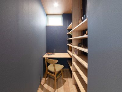 仕事の内容にもよりますが、書斎として個室にしてしまうよりも、夫婦や親子で一緒に使えるデスクをリビングやダイニングあるいは寝室の一角に計画するとスペースを有効に使うことができます。