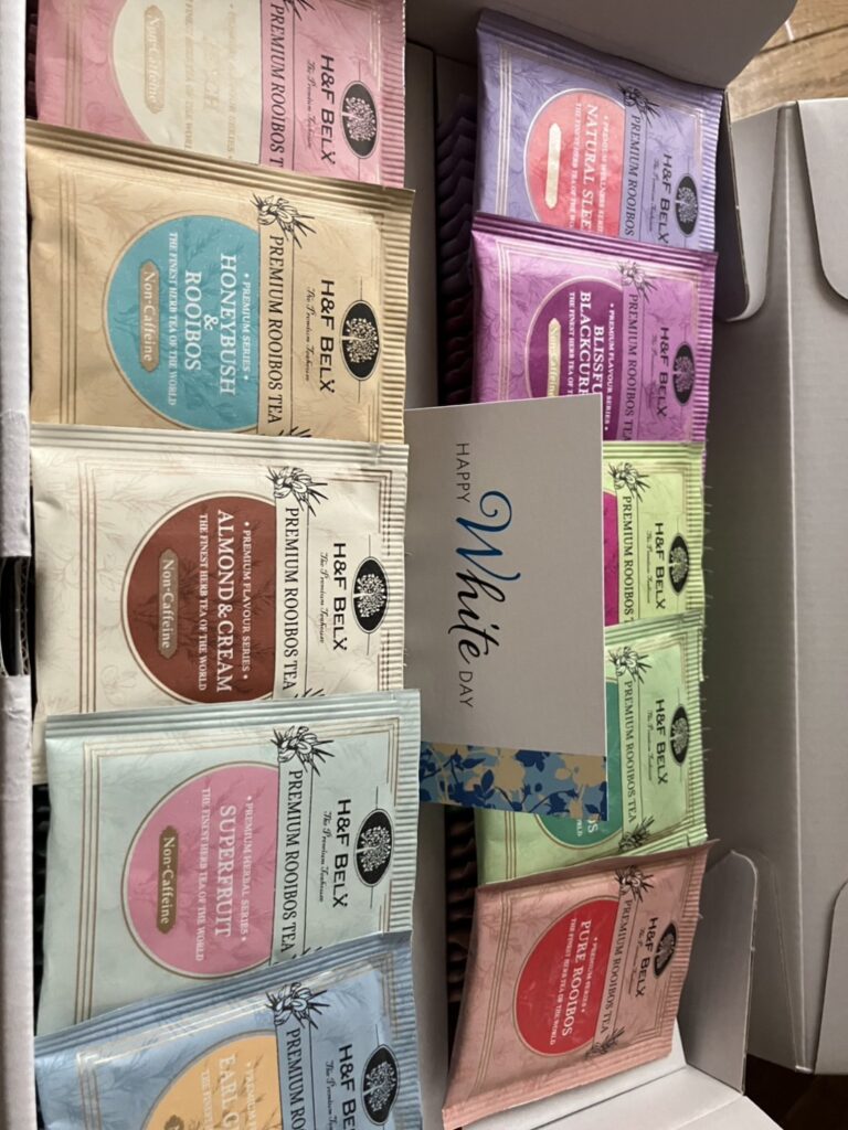 ノンカフェインで色んな香りが入っている紅茶100セットをプレゼントしました。